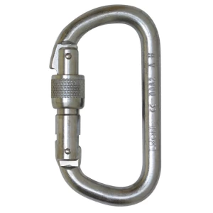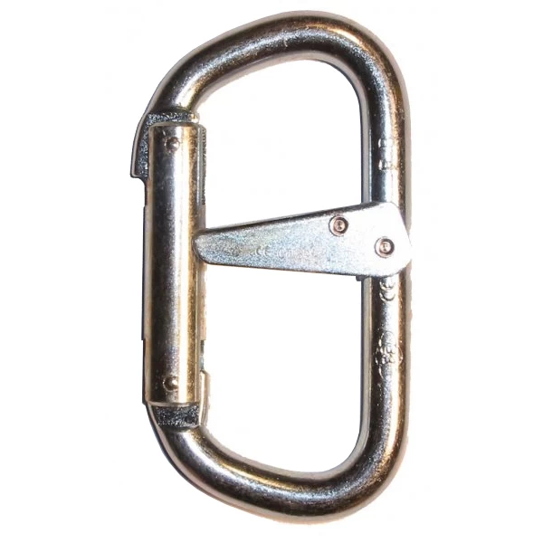 Double-action steel carabiner with a central sprung bar to prevent accidental gate opening and prevent cross-loading; ideal for connecting fall arrest lanyards to the harness.